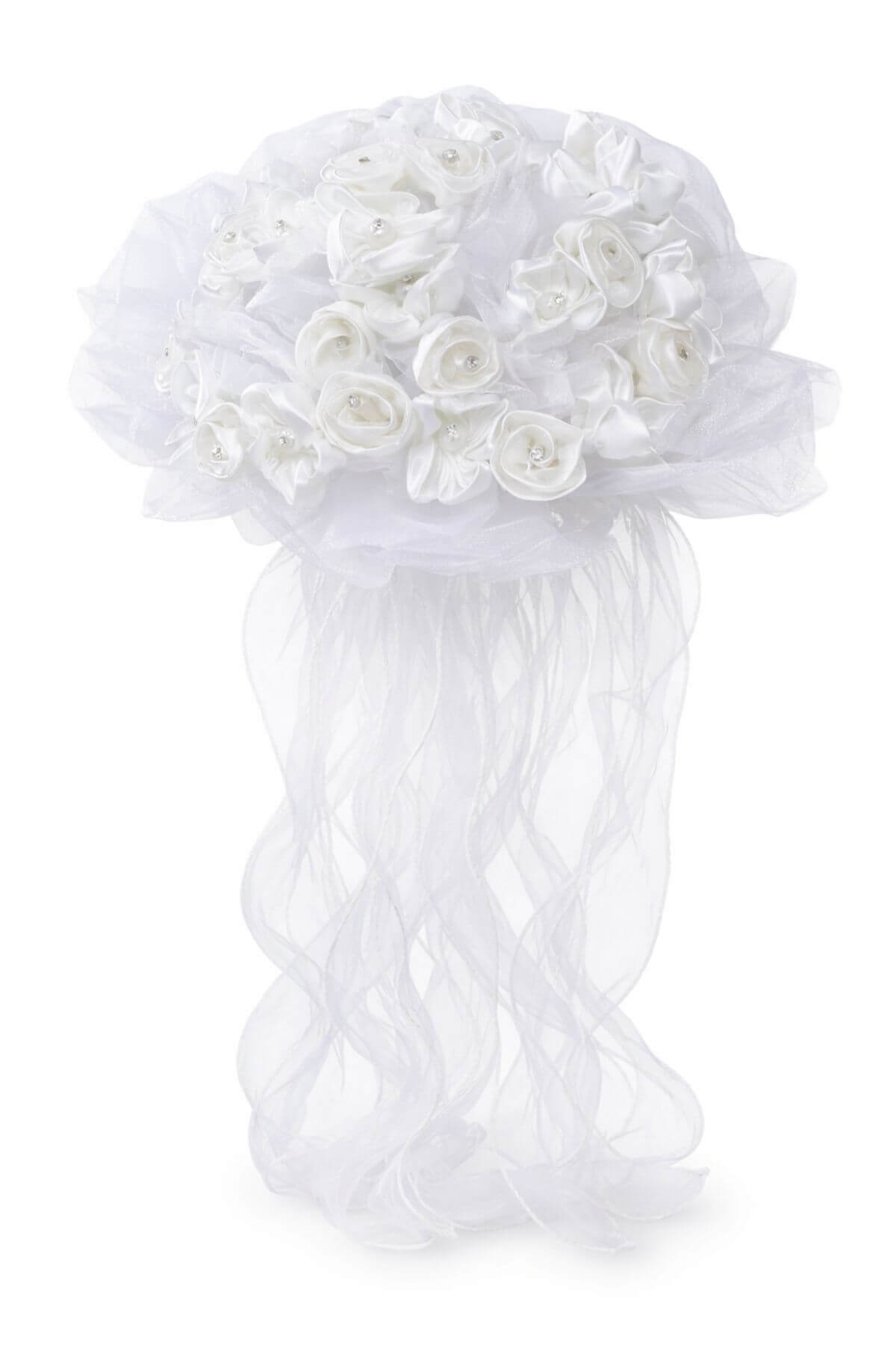 Biela luxusná kytica vyrobená zo saténových stužiek pripomínajúcich ruže, ktoré majú v strede ozdobné korálky s diamantom. Kytica je dozdobená priehľadnou organzou. Kytica sa dá použiť na výrobu svadobných pierok alebo ju je možné vyzdobiť umelými kvetmi.
