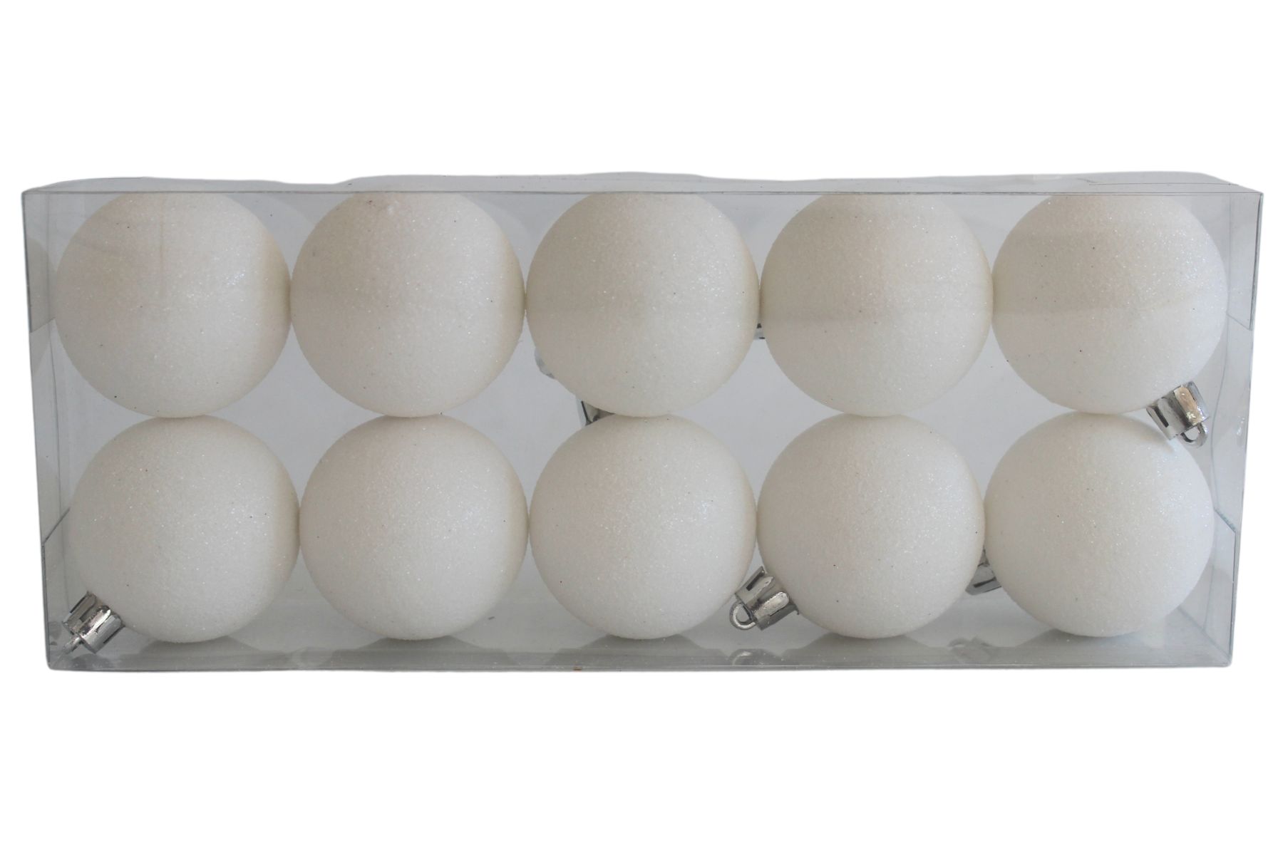 Biele plastové gule s trblietkami sú vhodné na zavesenie na vianočný stromček alebo ako dekorácia do vianočných aranžmánov a vencov.
