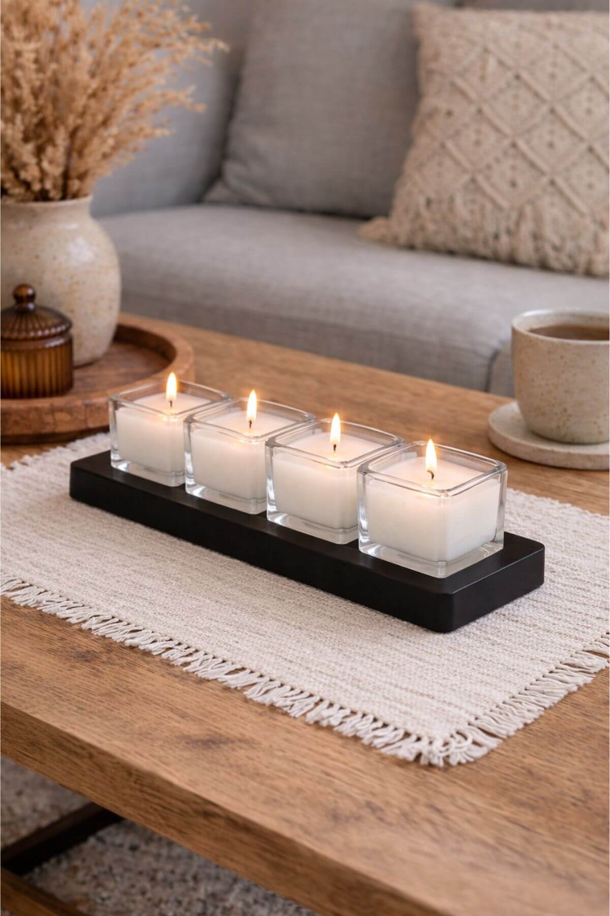 Tieto sviečky na drevenej tácke sú vhodné ako celoročná dekorácia na stôl či komodu
