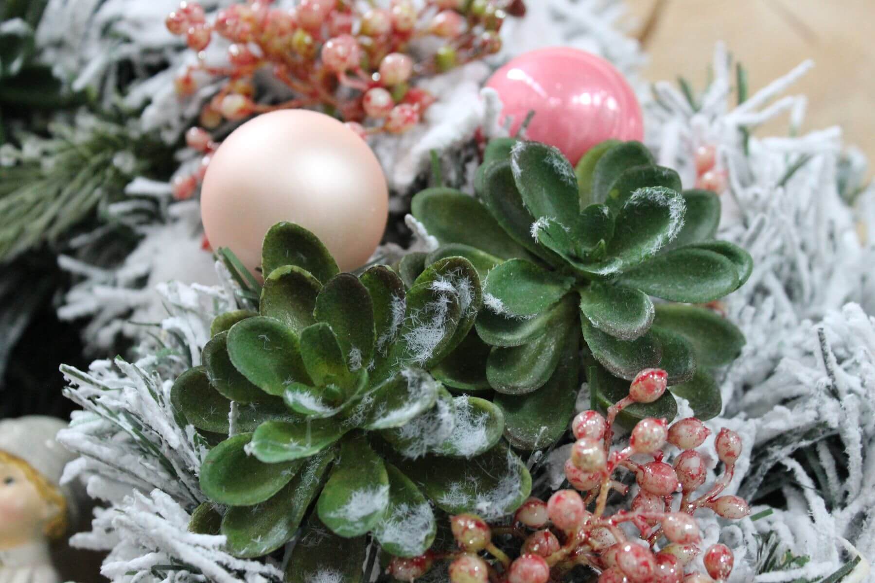 Veniec vianočný ružovozelený so spievajúcimi slečnami vhodný na zavesenie na dvere.Na slamennom kruhu zakrytom umelou čečinou zasneženou sú aplikované zasnežené sukulenty dotvorené umelou zeleňou,ružovými guličkami,ružovou dáliou a stuhou.
