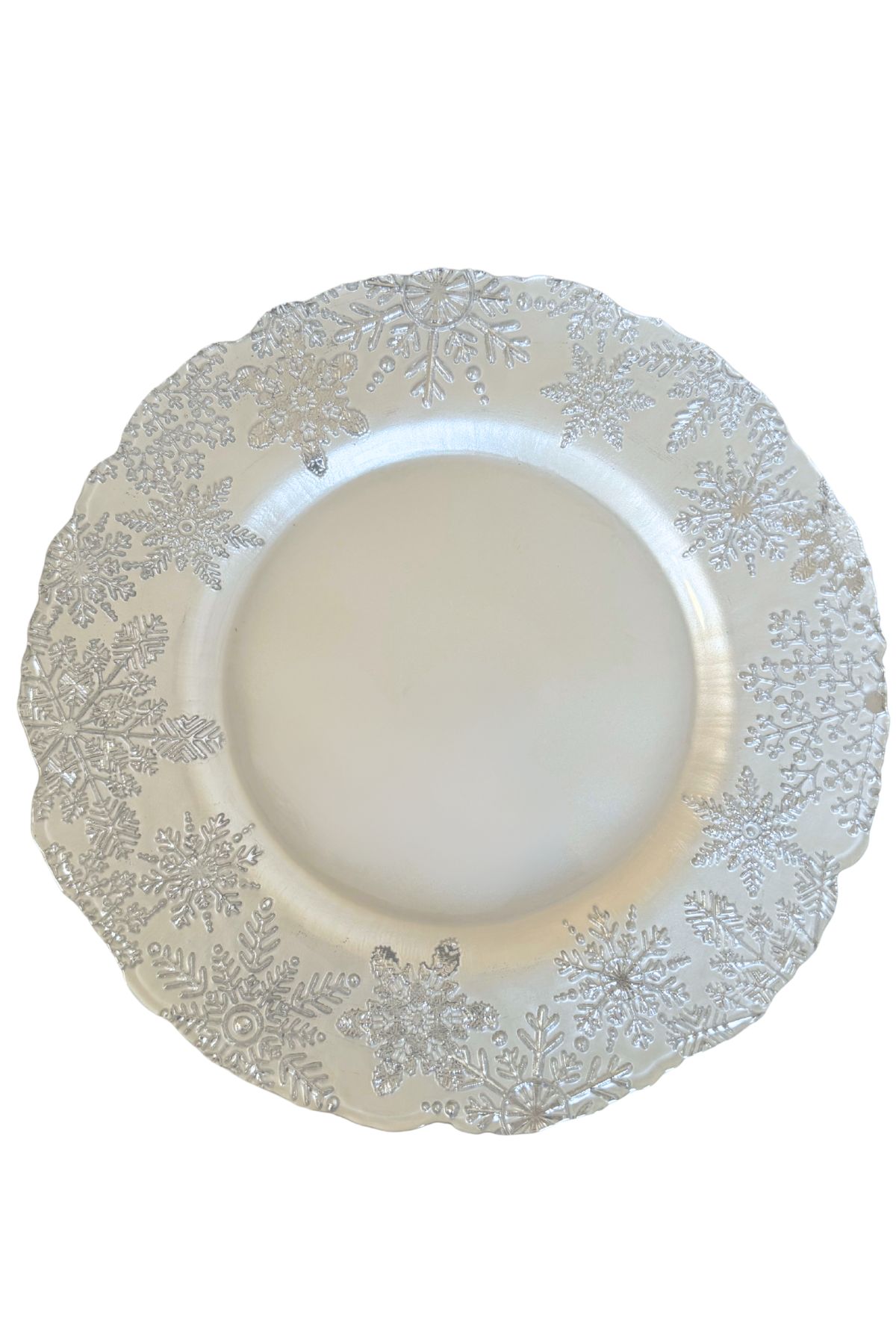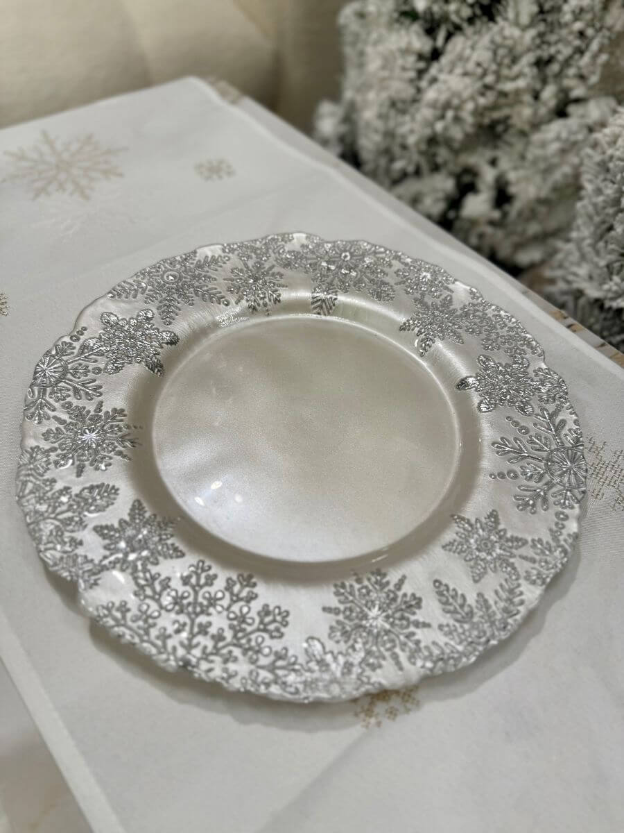 Sklenený tanier v elegantnom bielo-striebornom prevedení je vhodný ako vianočná dekorácia na sviatočný stôl. Vynikne aj ako podklad pre aranžmány.