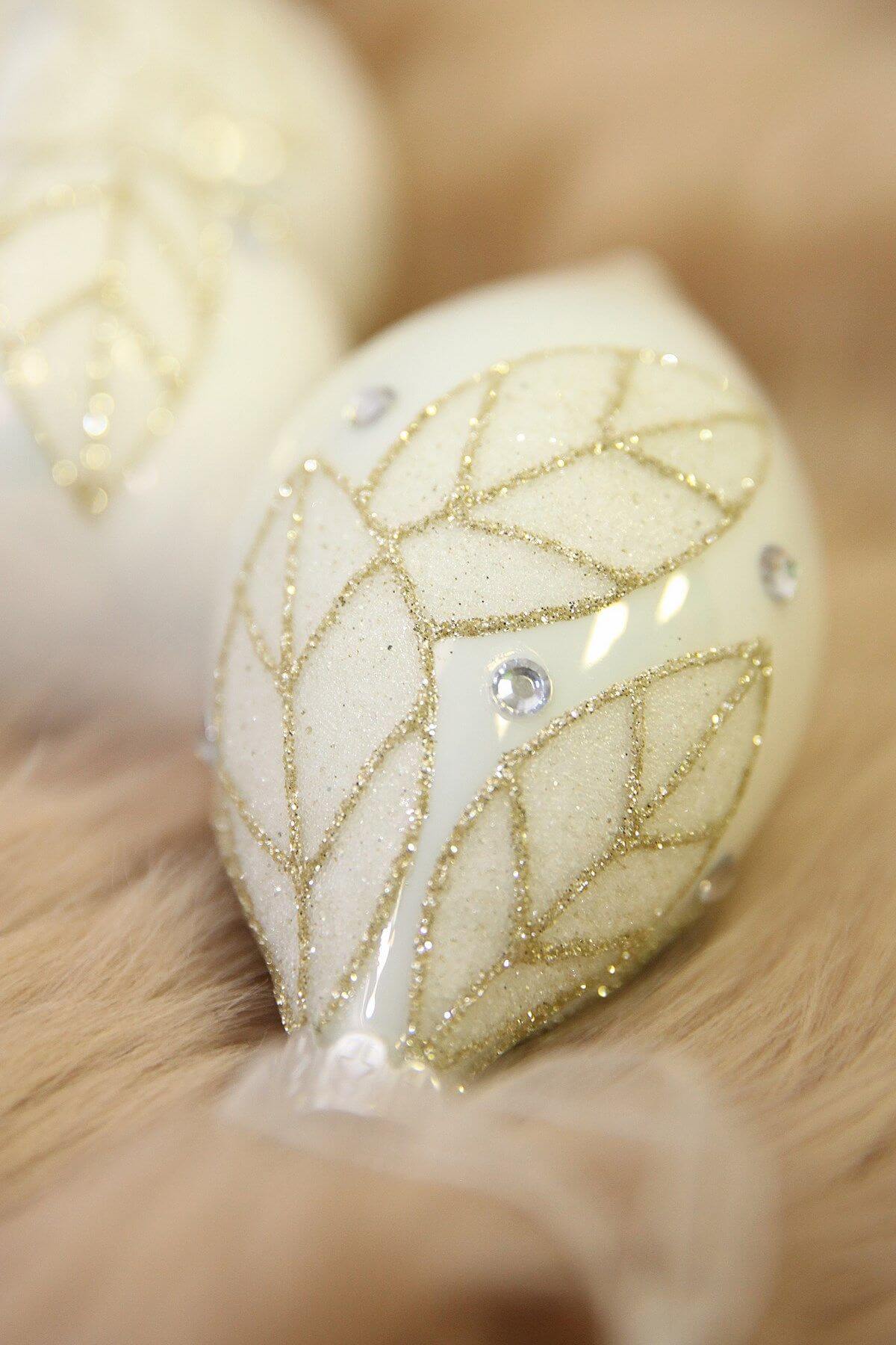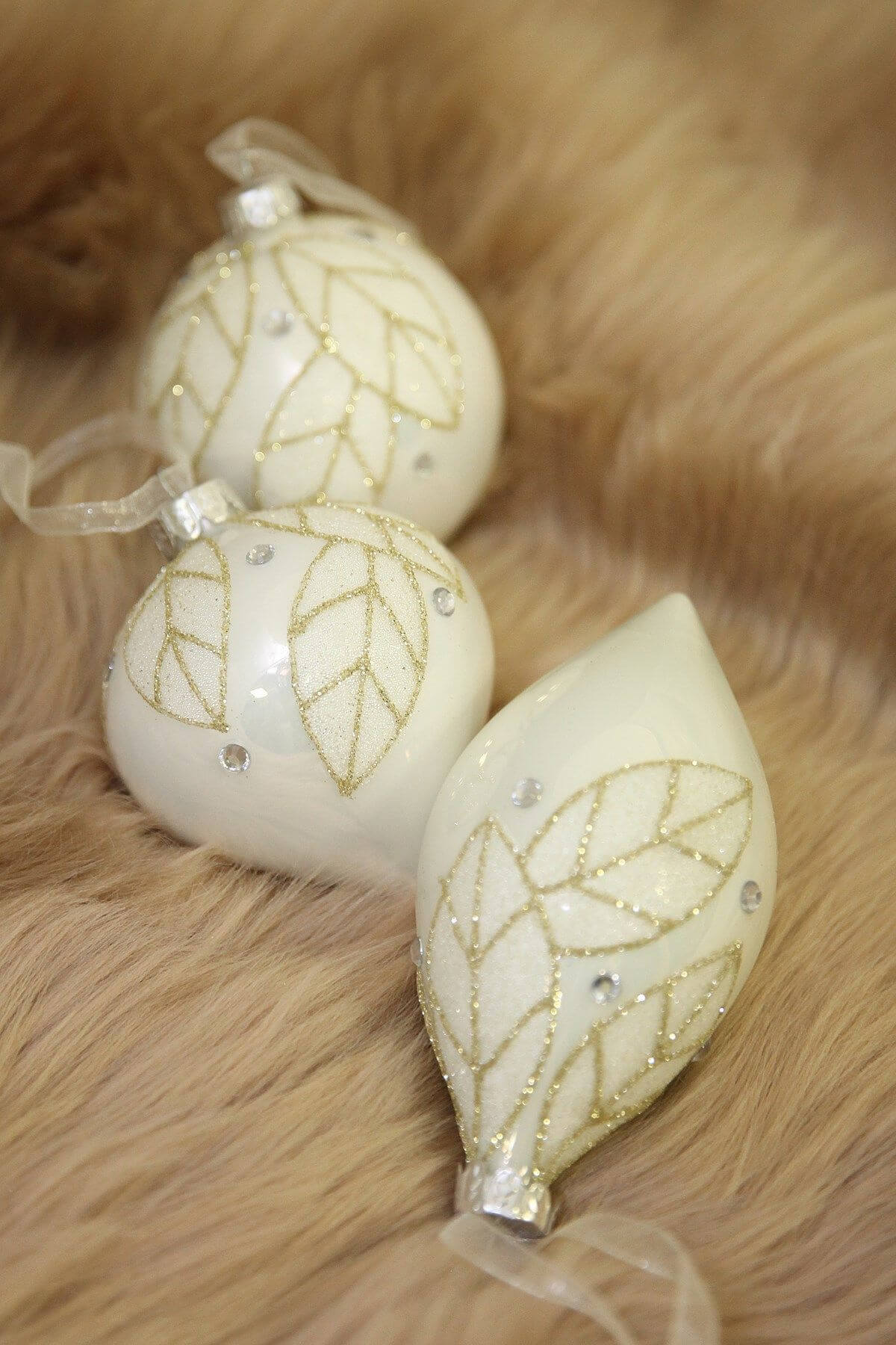 Biele sklenené vianočné ozdoby sú ozdobou každého vianočného stromčeka. Gule sú jemne zdobené zlatými lístkami, pôsobia veľmi jemne a romanticky. Balenie obsahuje guľu, cimburínu a šišku.