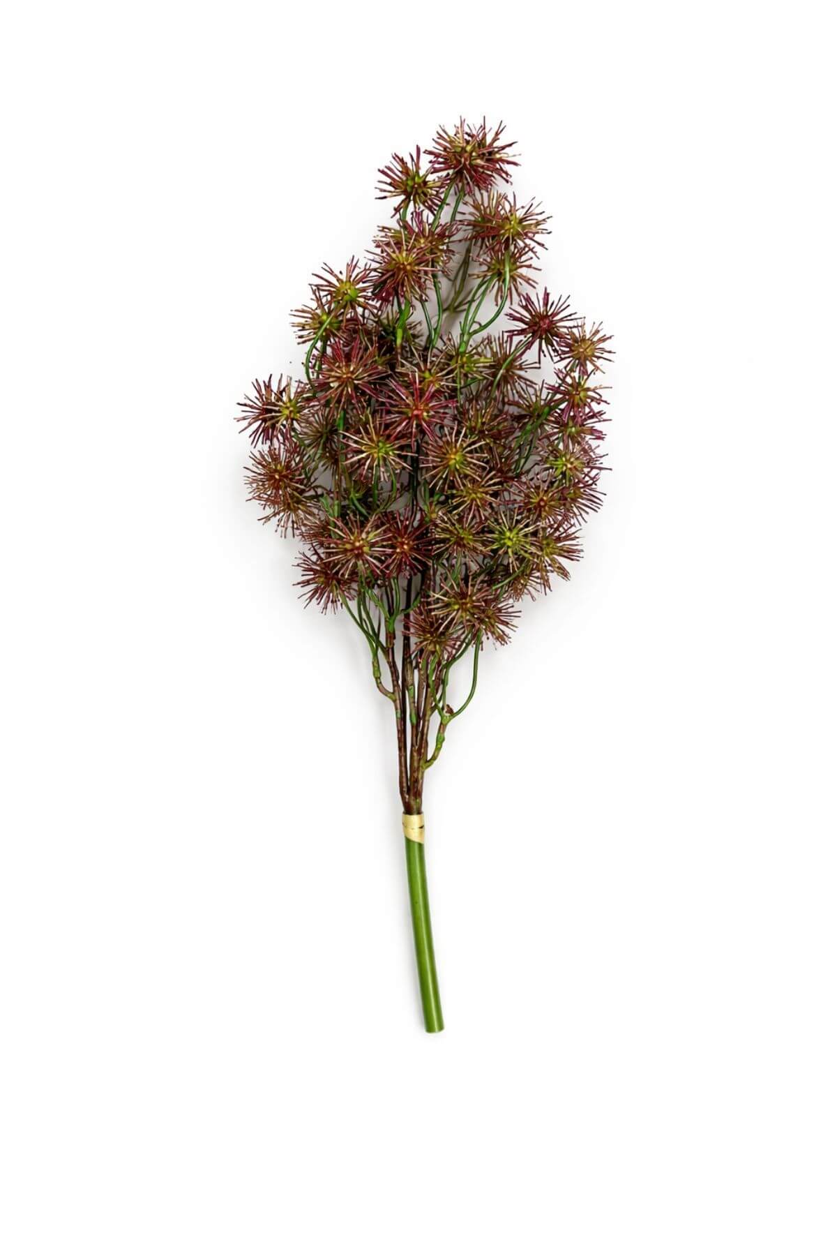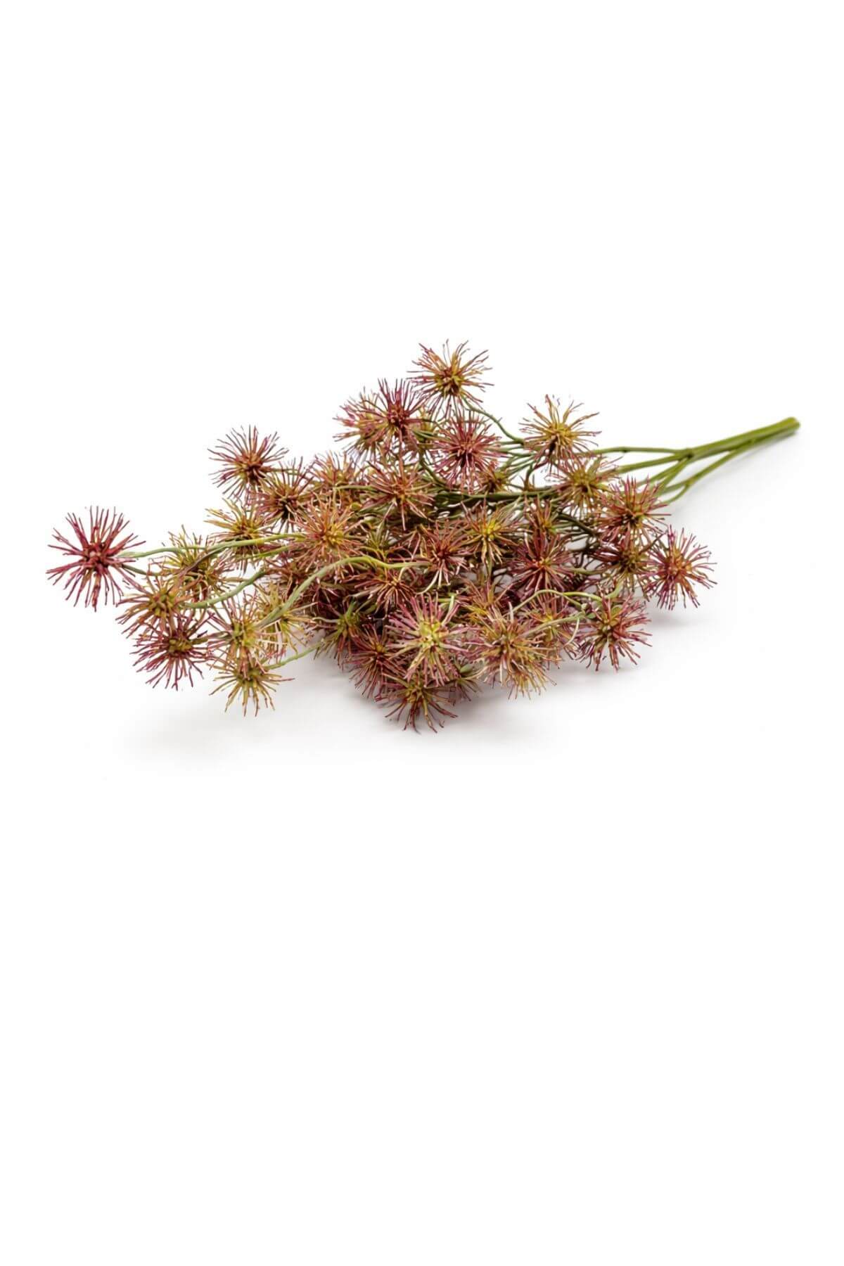 Farebná bordovozelená umelá kytička z lúčnych bodliačikov, ktorá má sedem konárikov a je vhodná na aranžovanie.