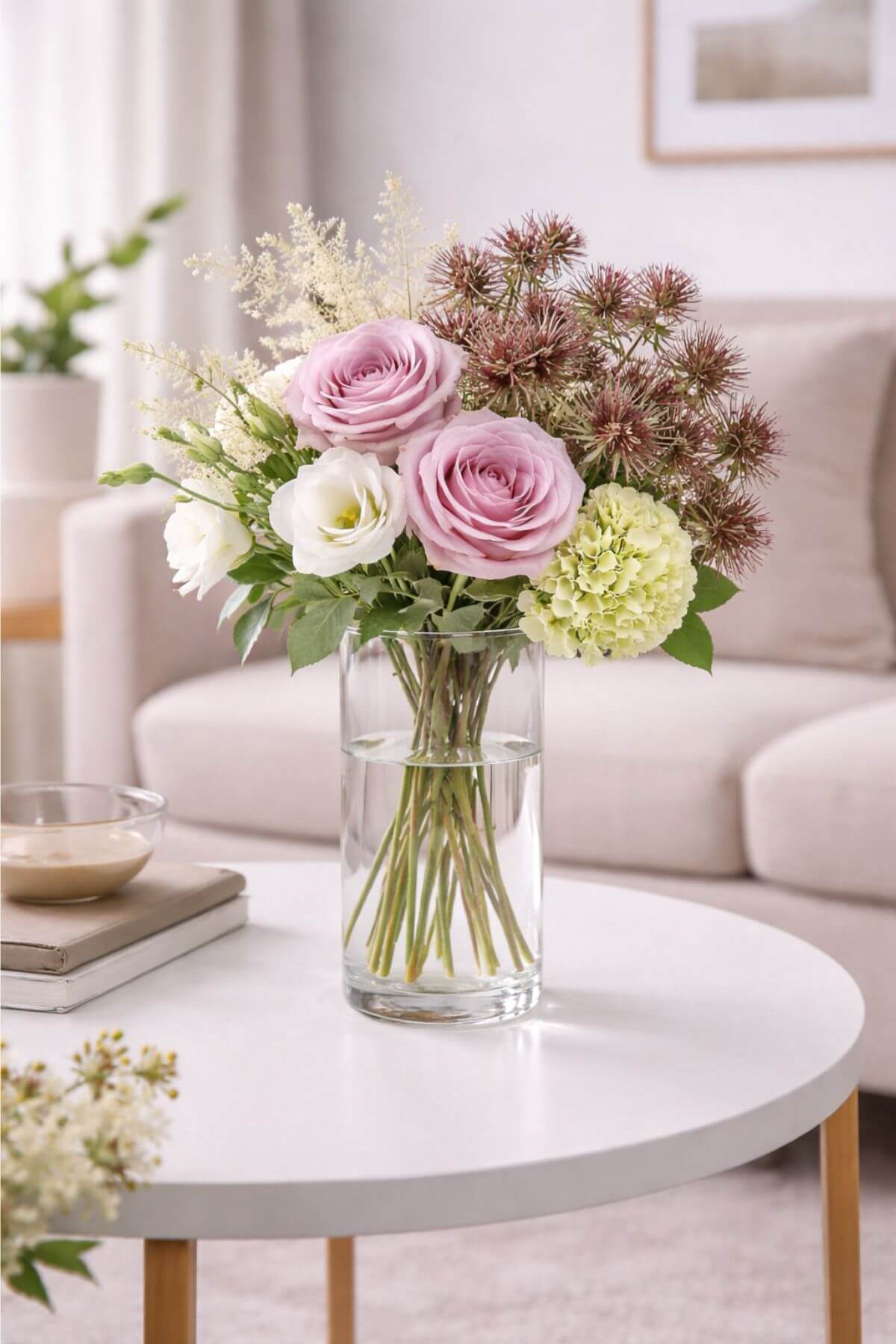 Bordovo zelená umelá kytička z bodliačikov 38cm