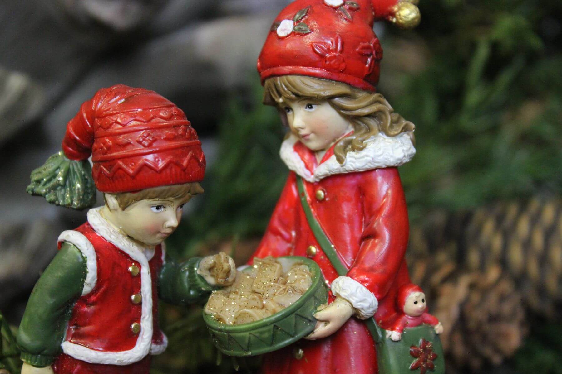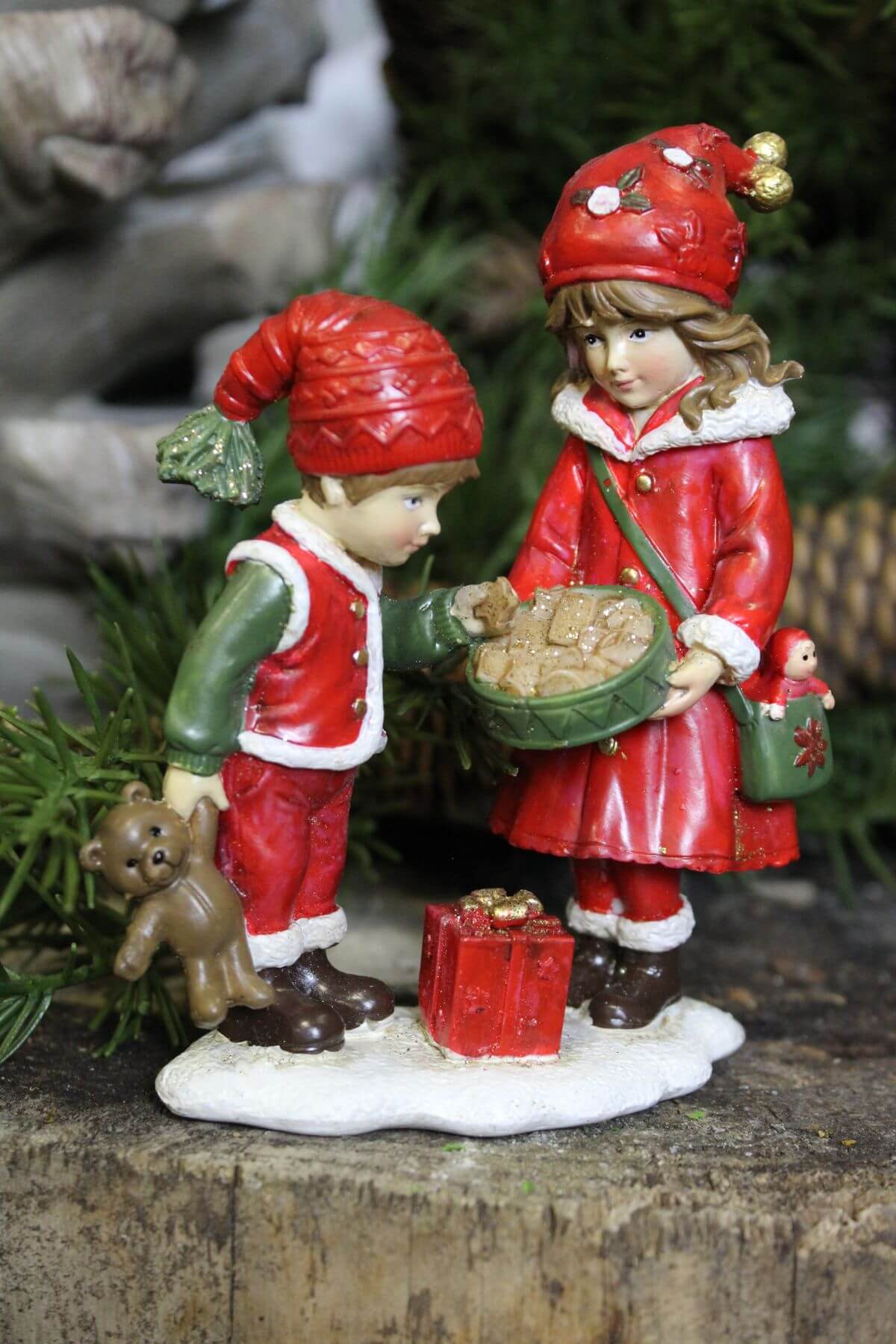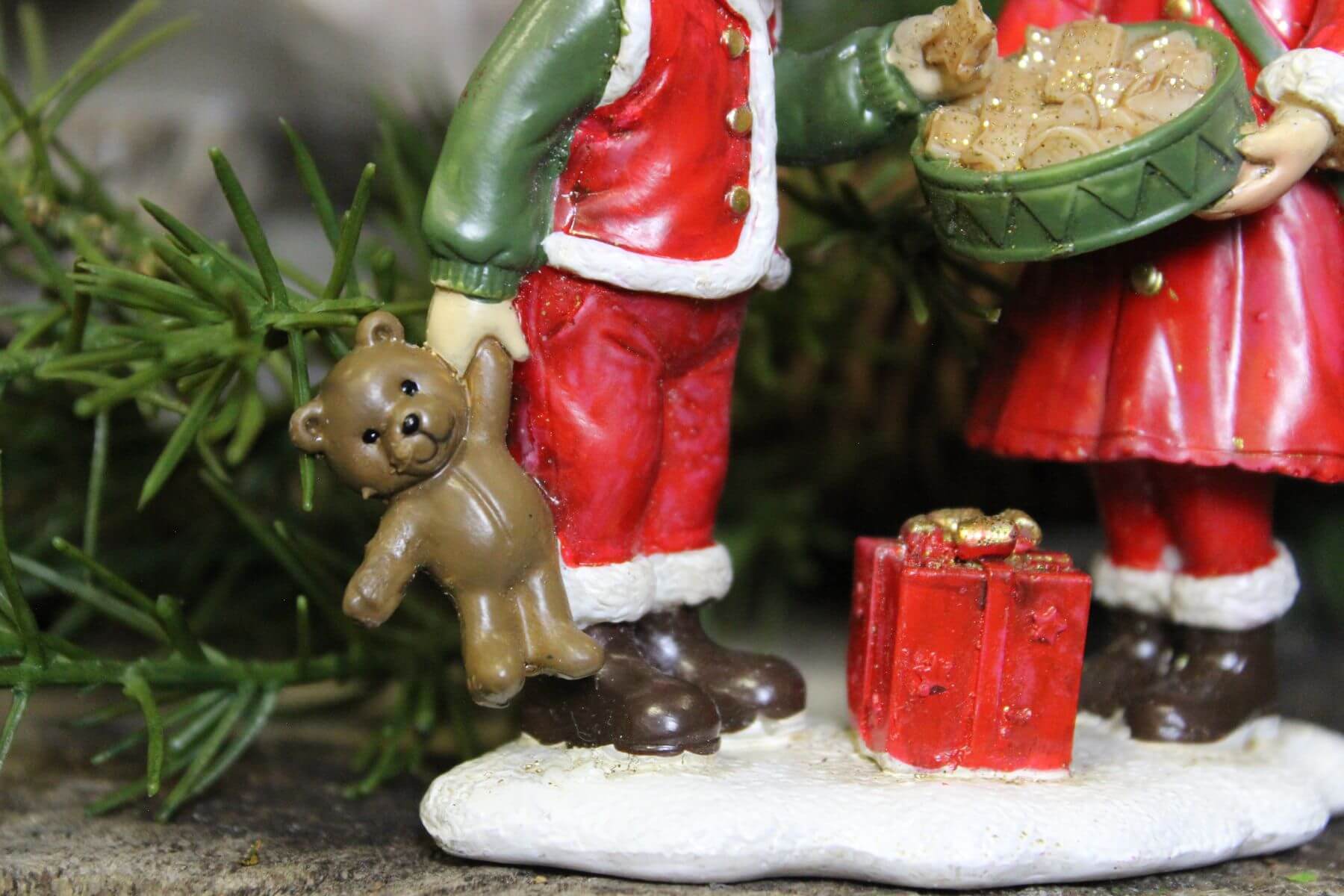 Figúrky chlapca s dievčatkom v červenom prevedení. Chlapček v červených nohaviciach a veste olemovanej bielou kožušinkou so zlatými gombičkami .Košieľka zelenej farby, v jednej ruke držiaci medvedíka hnedej farby.