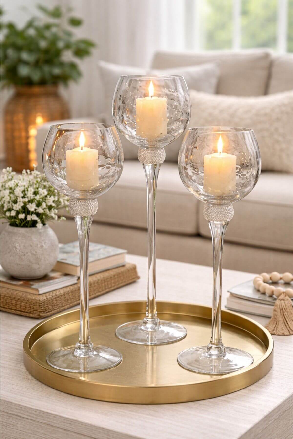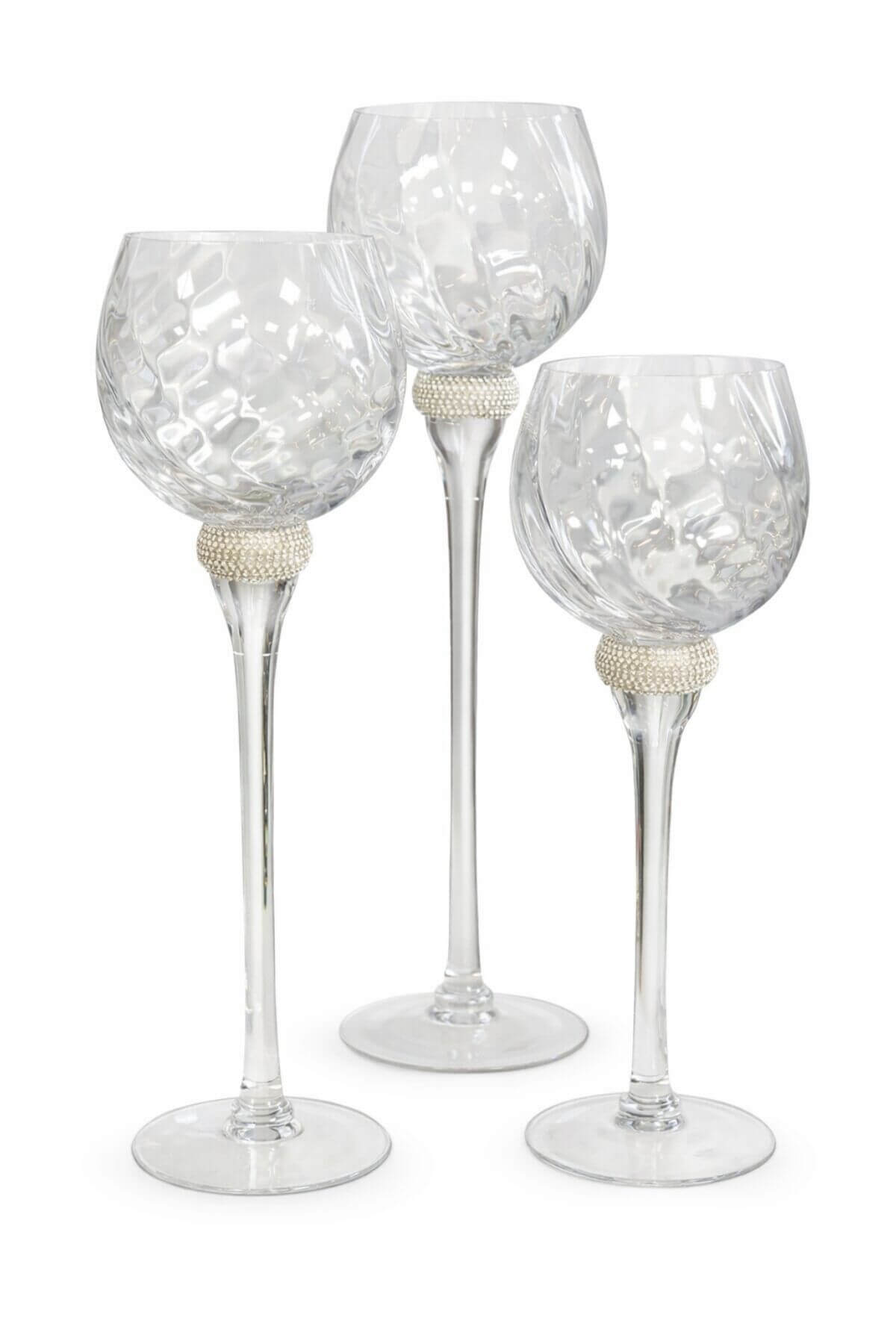 Sklenené svietniky sa môžu použiť ako základ na aranžovanie, alebo samostatne ako celoročná dekorácia na stôl do interéru. Sklo je detailne vpracované, dlhú stopku krásne dopĺňa kamienkový prstenec. Cez číre sklo detailne vynikne plameň sviečky.