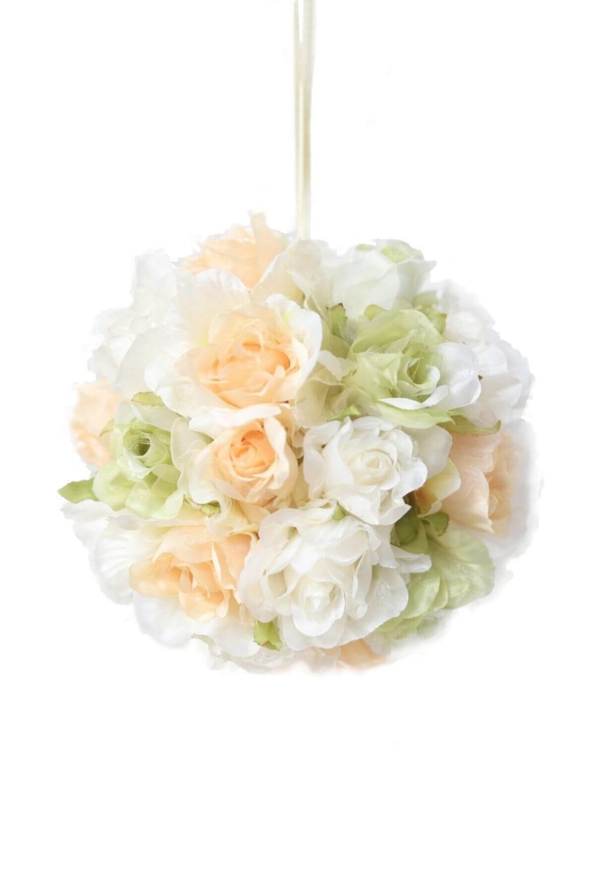 Farebná oranžovo krémovo zelená umelá závesná kvetinková guľa z ruží.