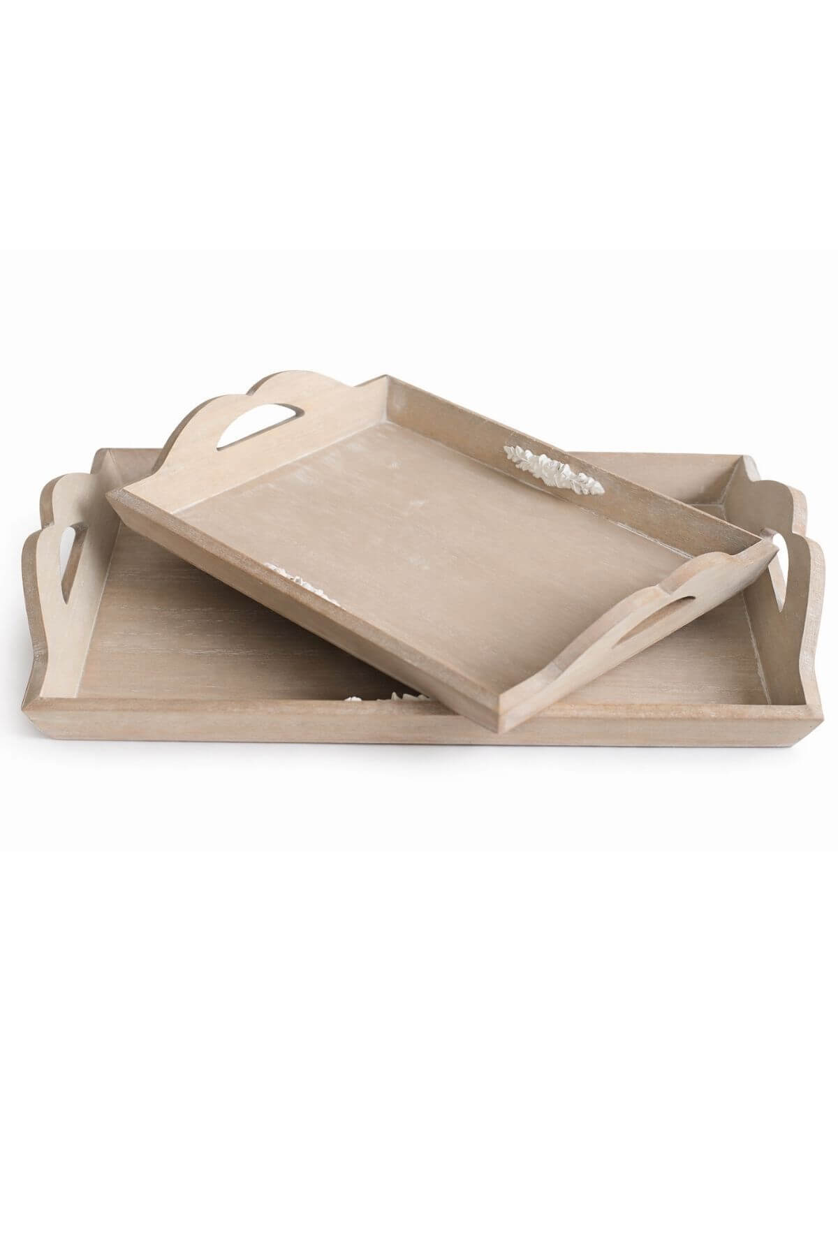 Hnedé drevené vintage tácky zdobené bielym ornamentom z vnútorných strán.Uvedená cena je za dvojset.
