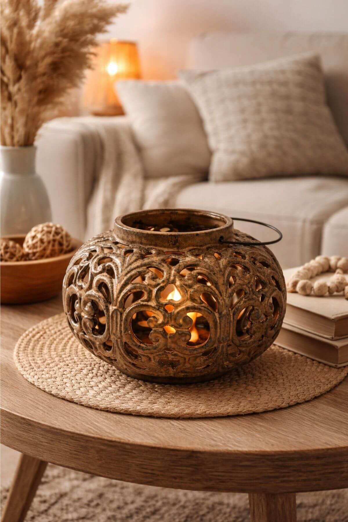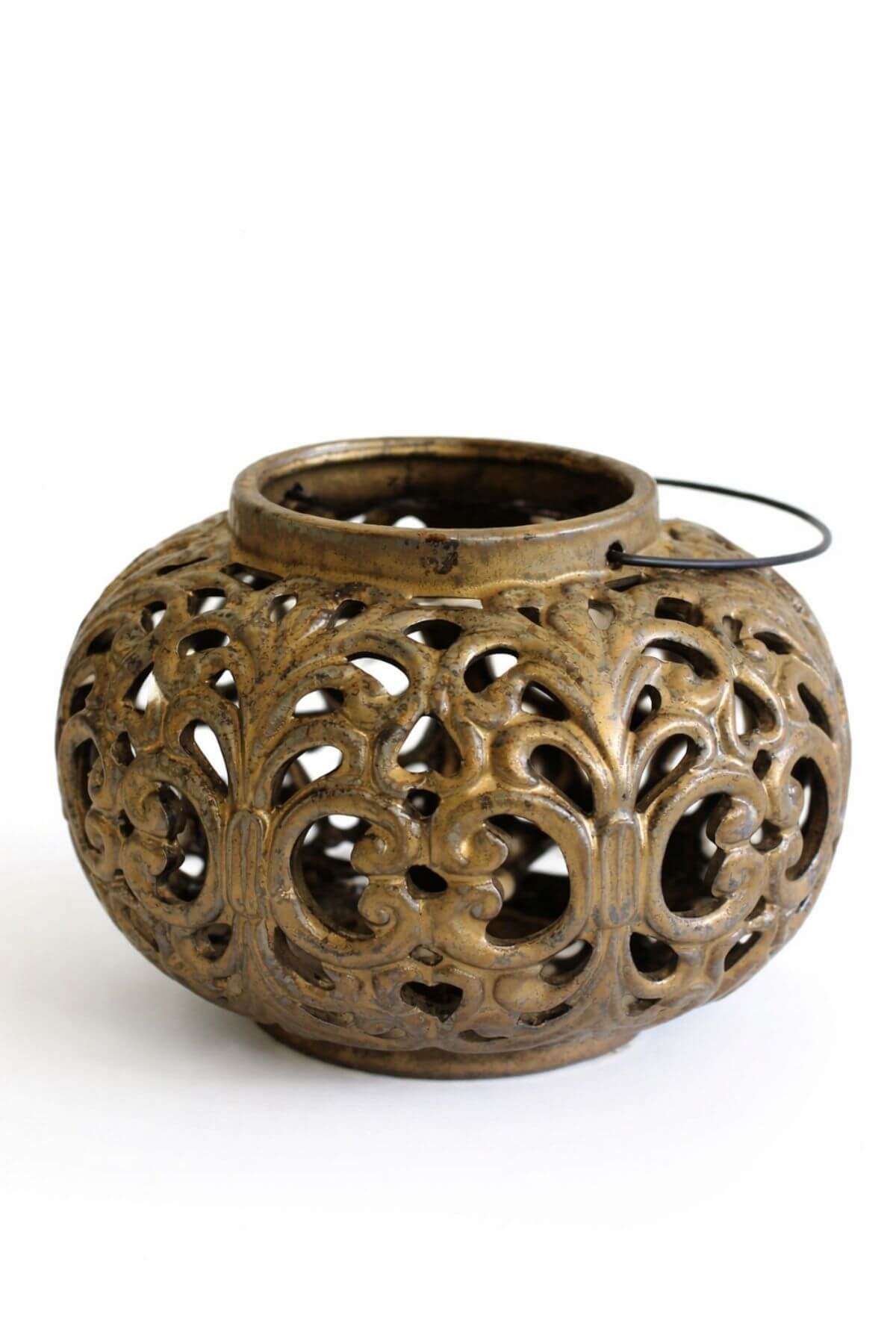 Hnedo-zlatý keramický lampáš s ornamentom je vhodný na položenie na stôl, ale aj na zavesenie, nakoľko má pripevnené kovové madlo. Lampáš neobsahuje sviečku. Je vhodný ako dekorácia či už na terasu alebo do interiéru.
