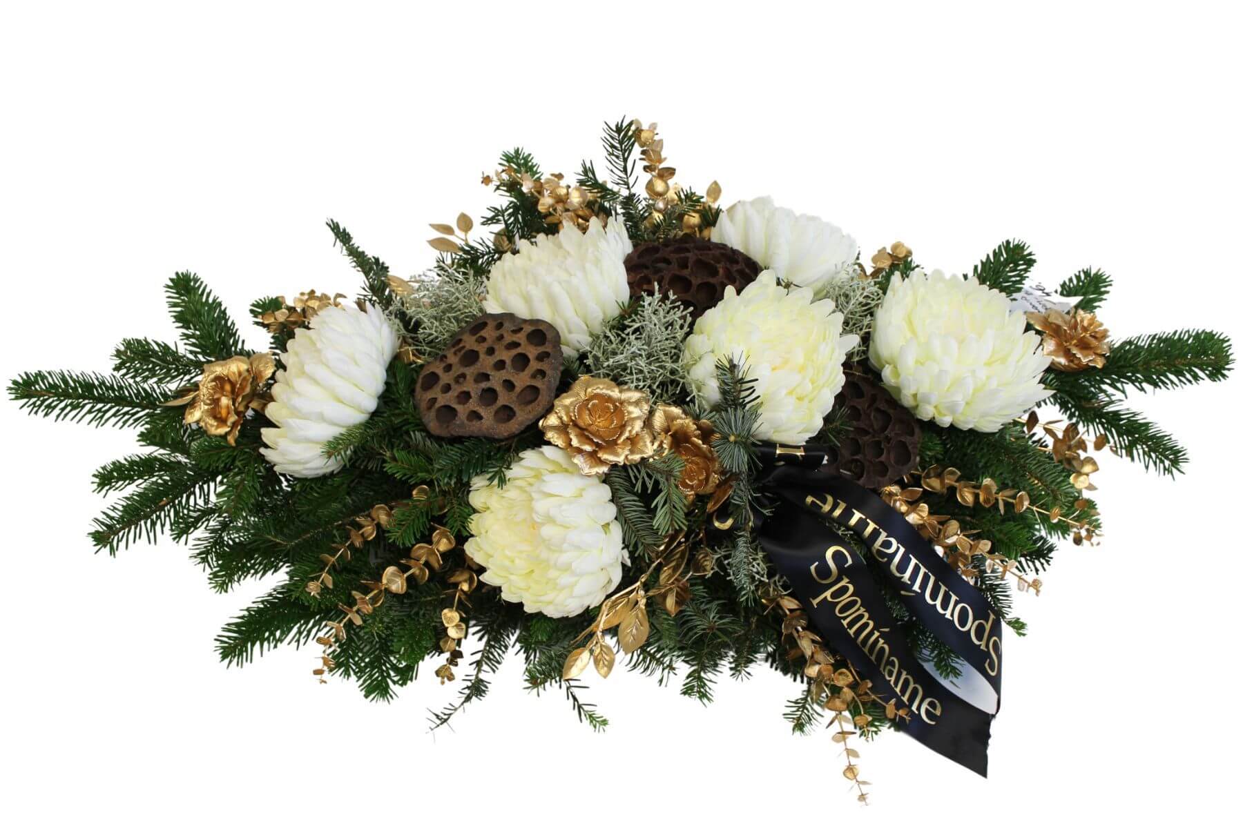 Krásna ikebana zo živej čečiny doplnená umelými chryzantémami, ktoré sú na nerozoznanie od živých. Každý kus je ručne vyrábaný originál, preto nemusí na 100% zodpovedať fotke.