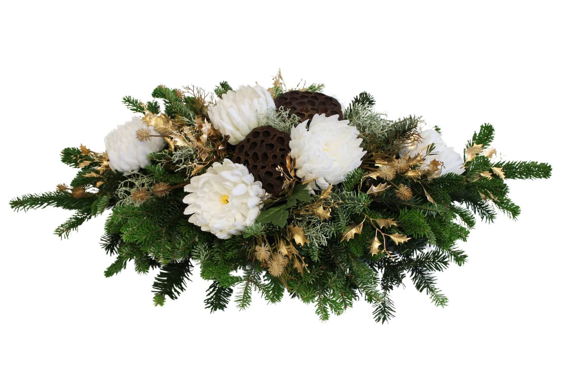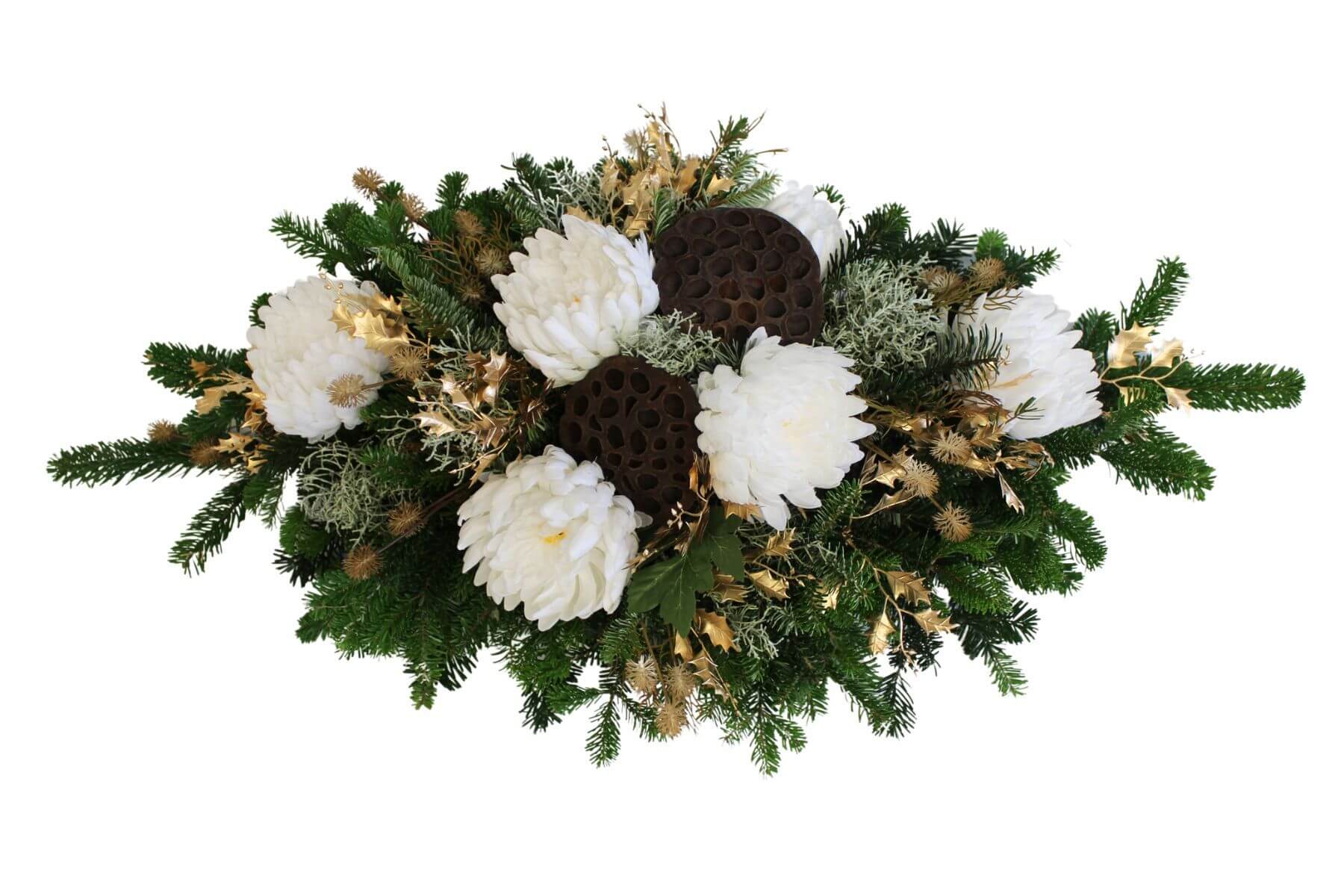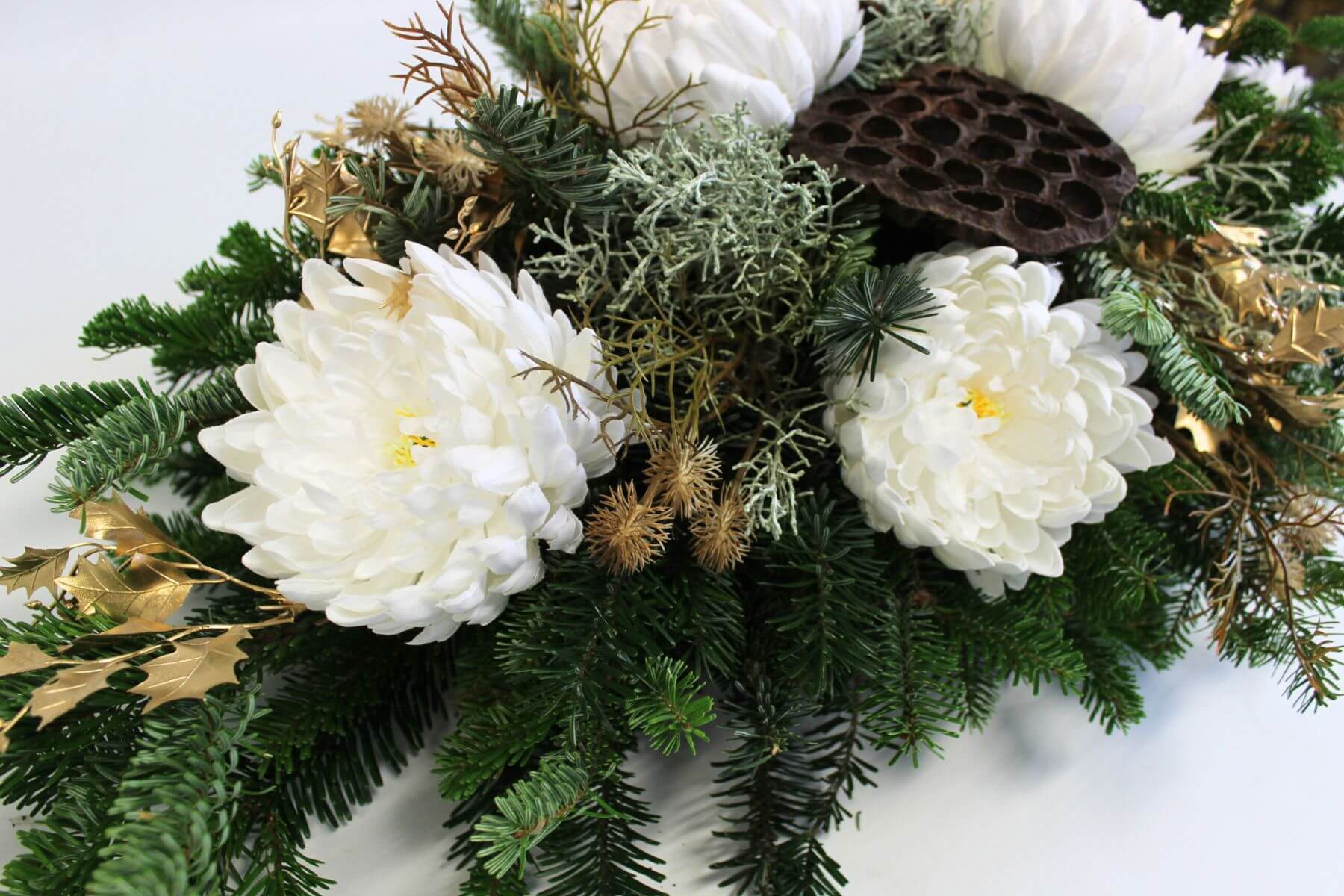 Krásna ikebana zo živej čečiny doplnená umelými chryzantémami, ktoré sú na nerozoznanie od živých. Každý kus je ručne vyrábaný originál, preto nemusí na 100% zodpovedať fotke.