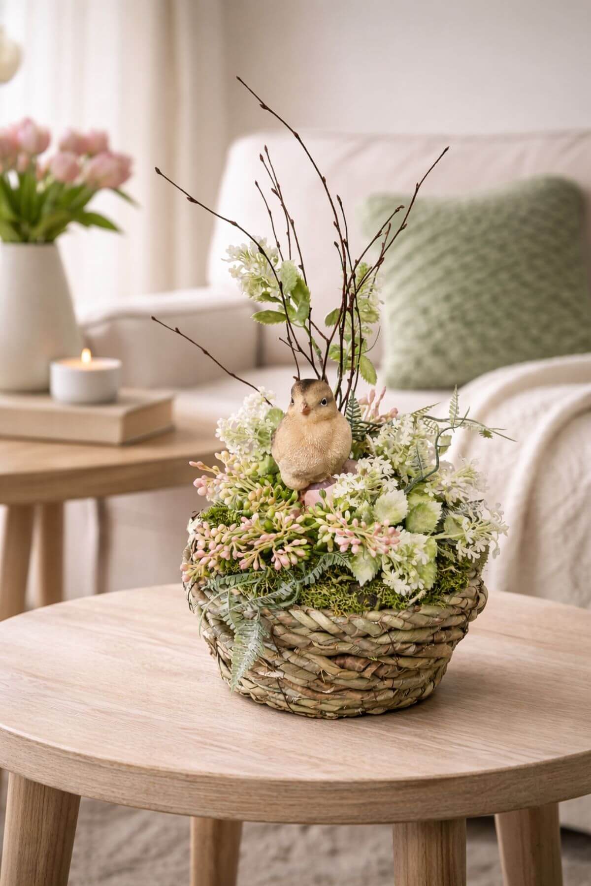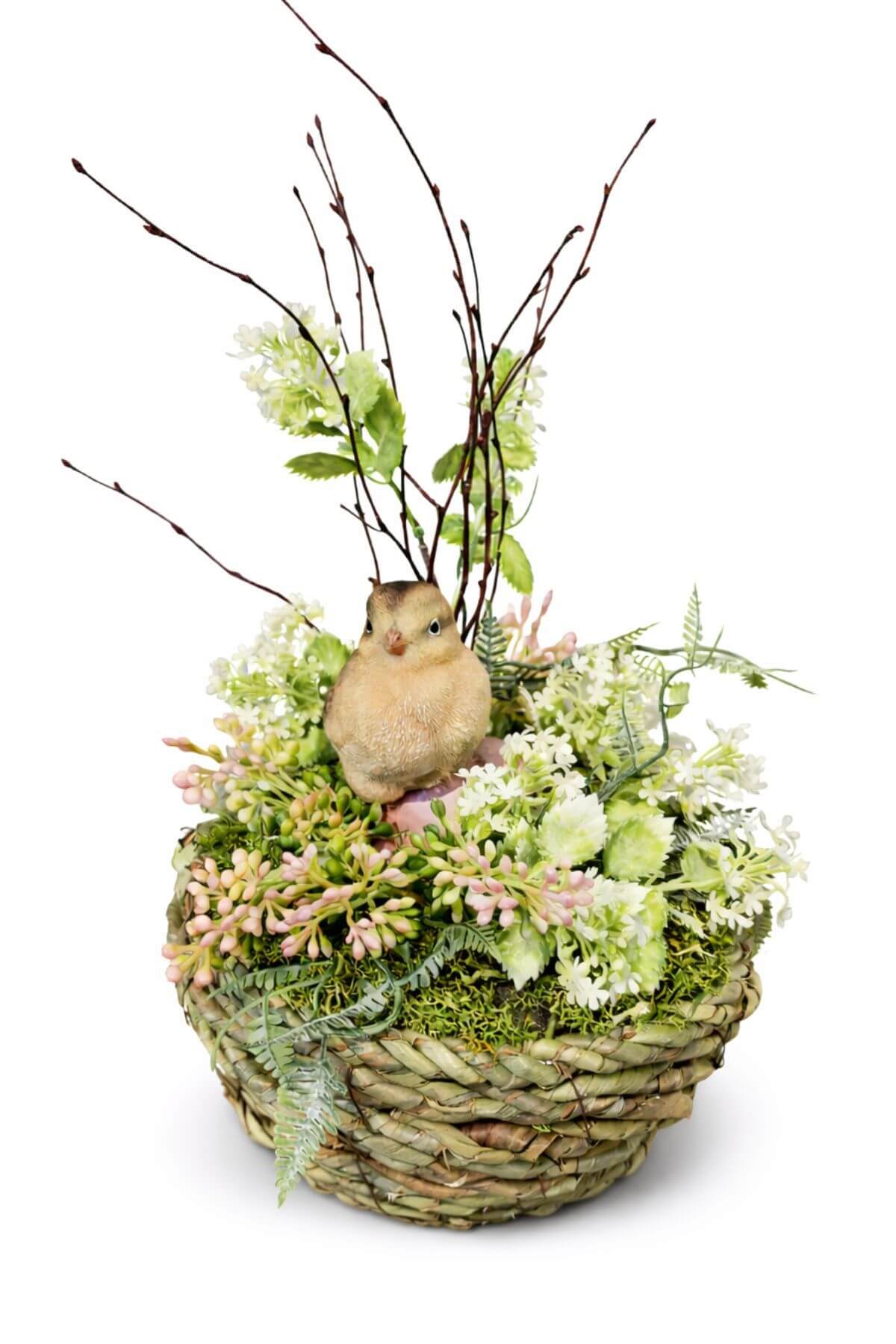Jarný dekoratívny aranžmán v pletenom košíku s jemnými kvetmi, zeleňou a roztomilým kuriatkom uprostred.