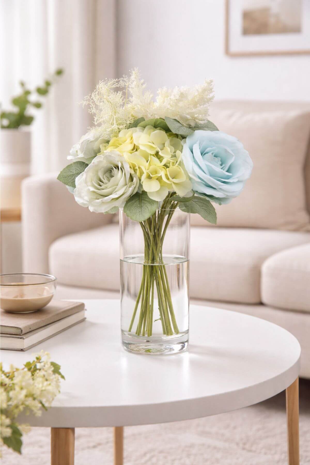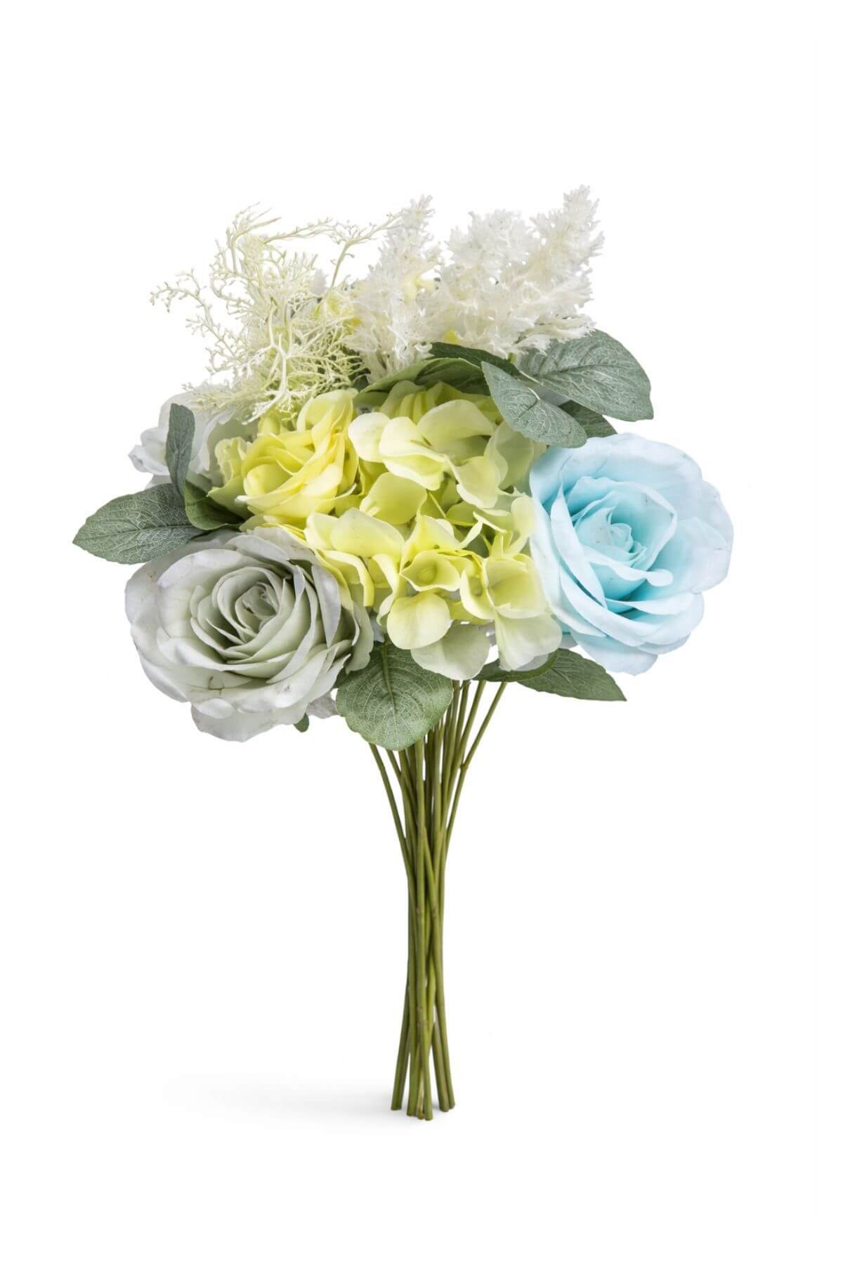 Krémovomodrá kytička vytvorená z ruží,hortenzie,trávy,zelene,celkovo 10 stopiek.