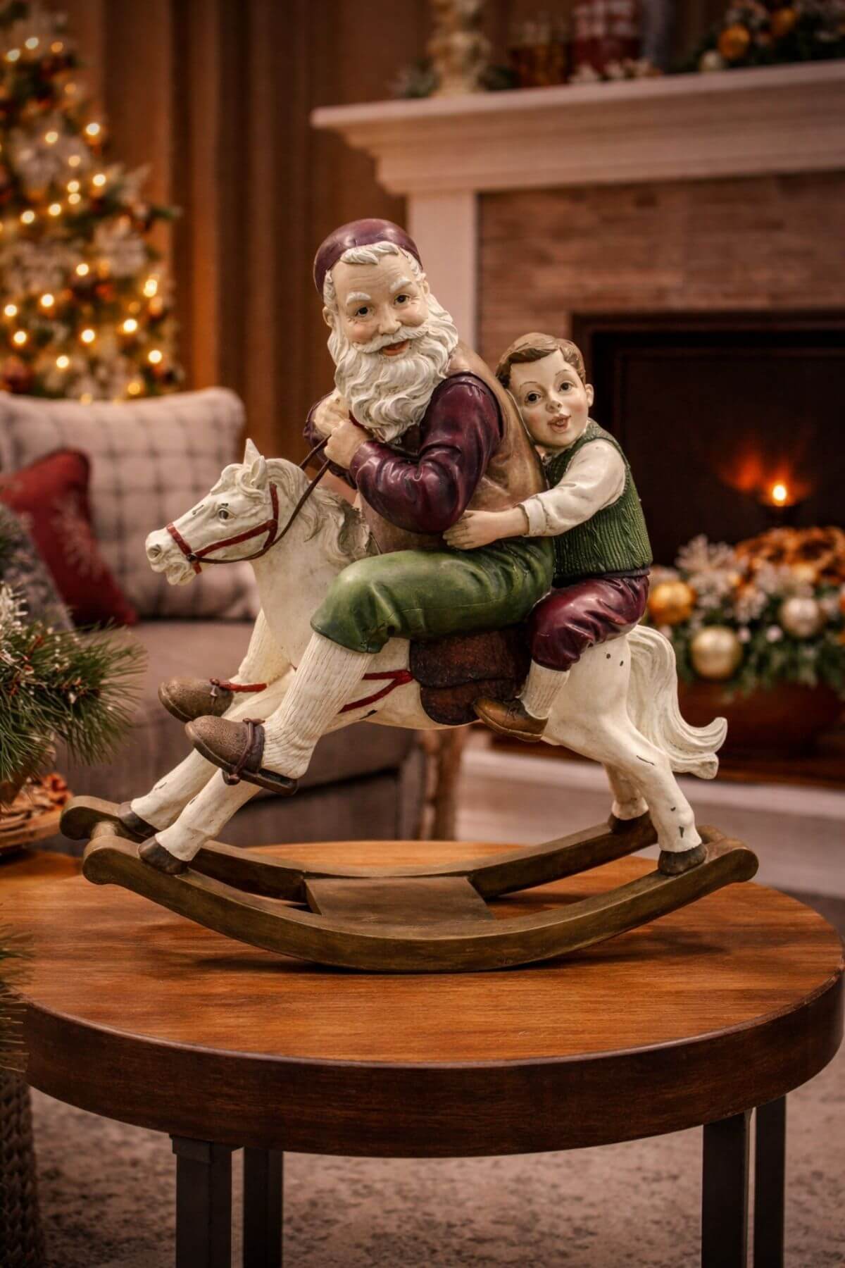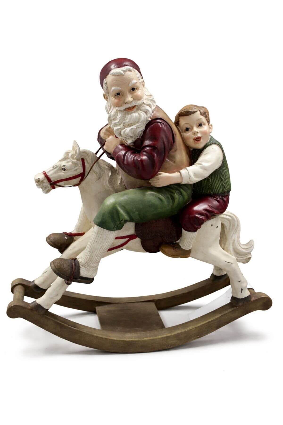 Červeno zelená retro vianočná dekorácia Mikuláša s chlapcom na bielom koníku vhodná na položenie pri vianočný stromček alebo krb. Dekorácia v tradičných farbách Vianoc má jemnú patinu.