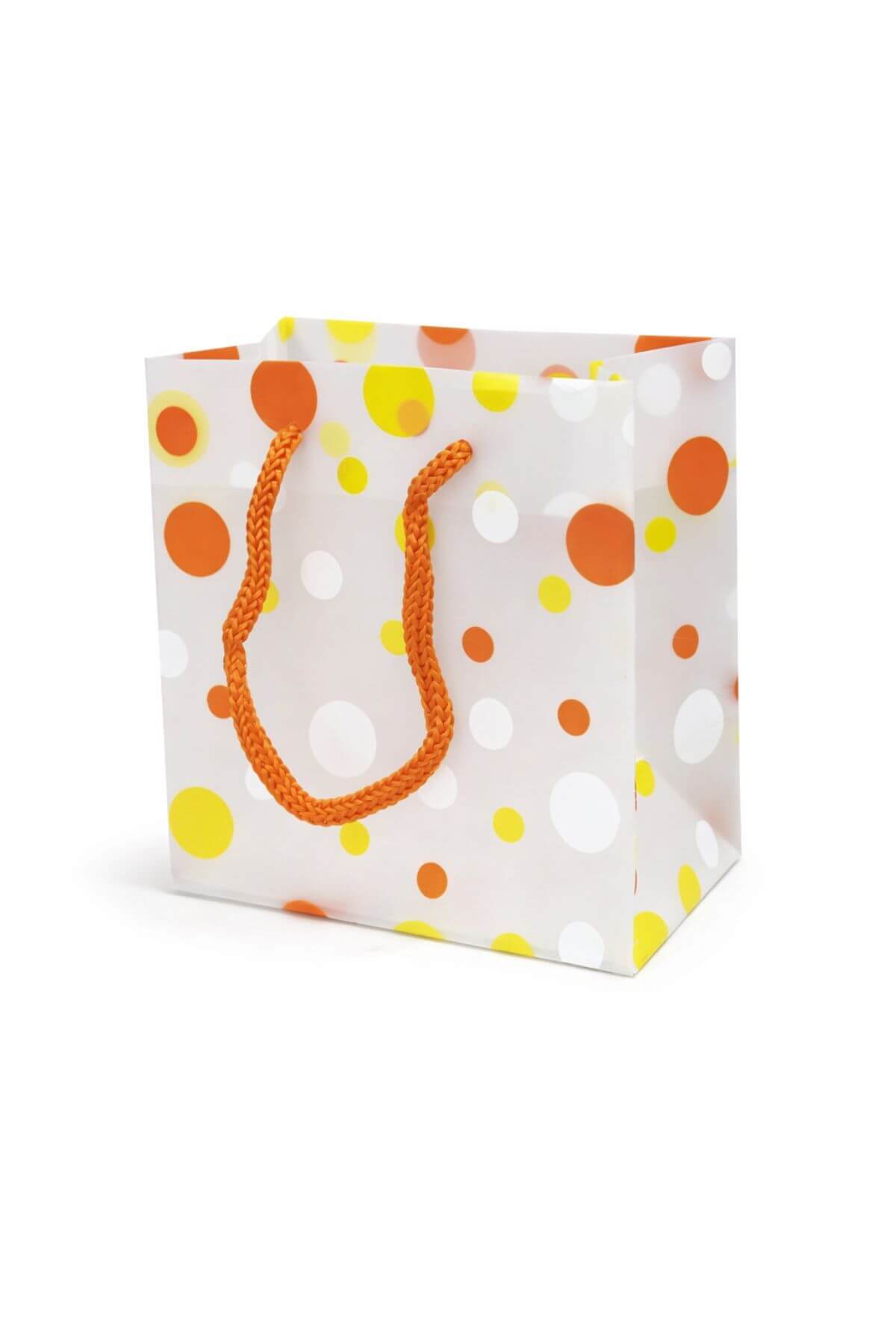 Oranžová darčeková taška s jemne priehľadným povrchom. Darčeková taška je zdobená s oranžovými, bielymi a žltými bodkami rôznych veľkostí. Darčeková taška má oranžovú šnúrku.