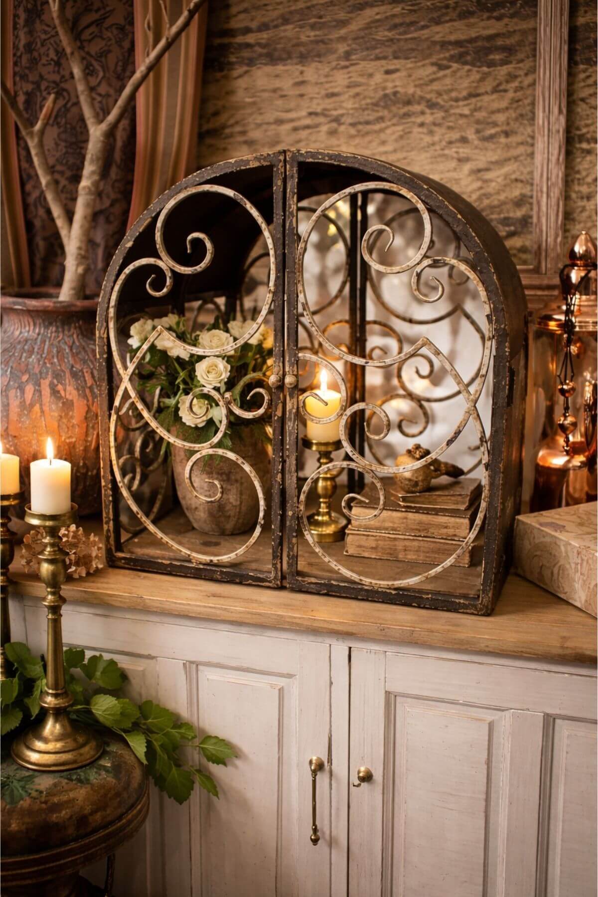 Čierna patinovaná skrinka (kozub), otvárateľná zdobená mreža v pozadí zrkadlo.