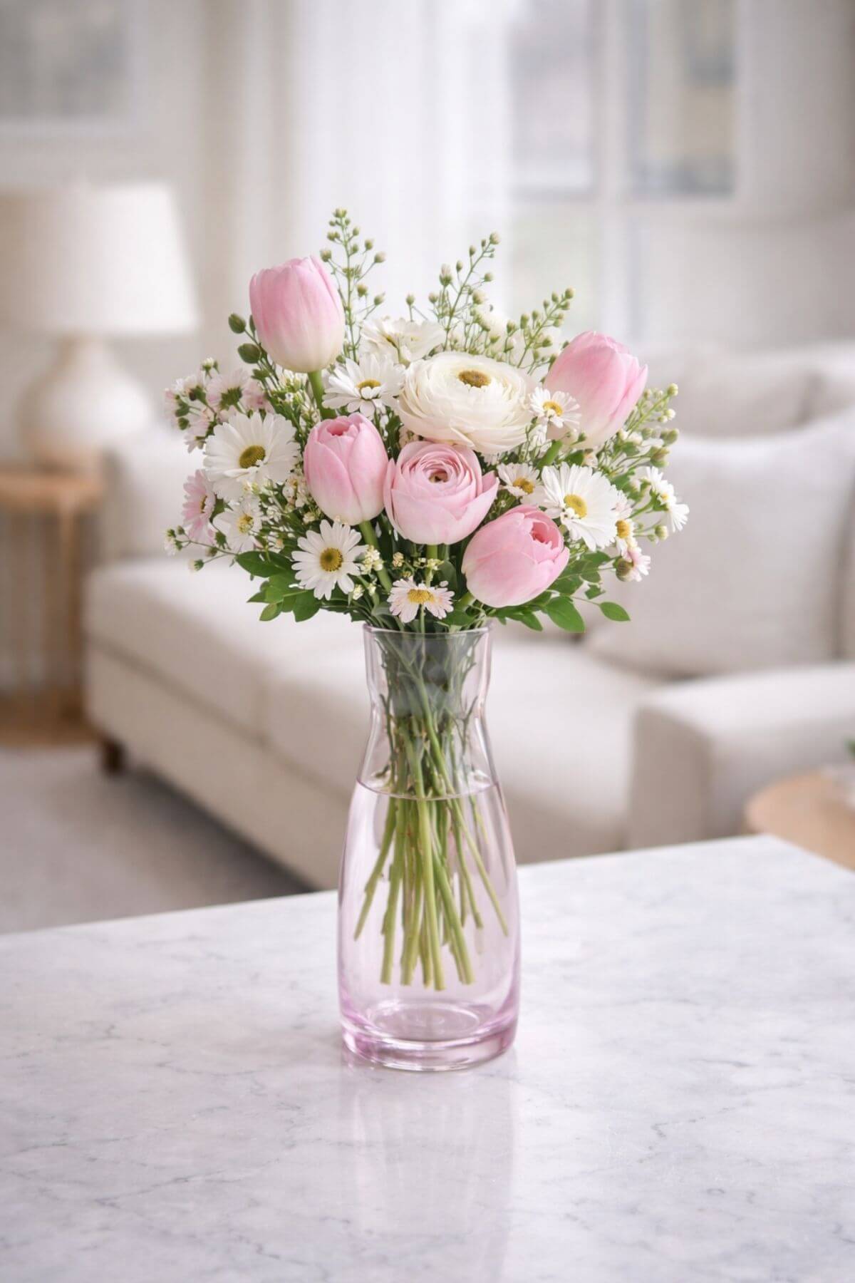 Ružová priesvitná váza na živé ale umelé kvety vhodná do interiéru. Váza je vhodná na stôl do obývačky.