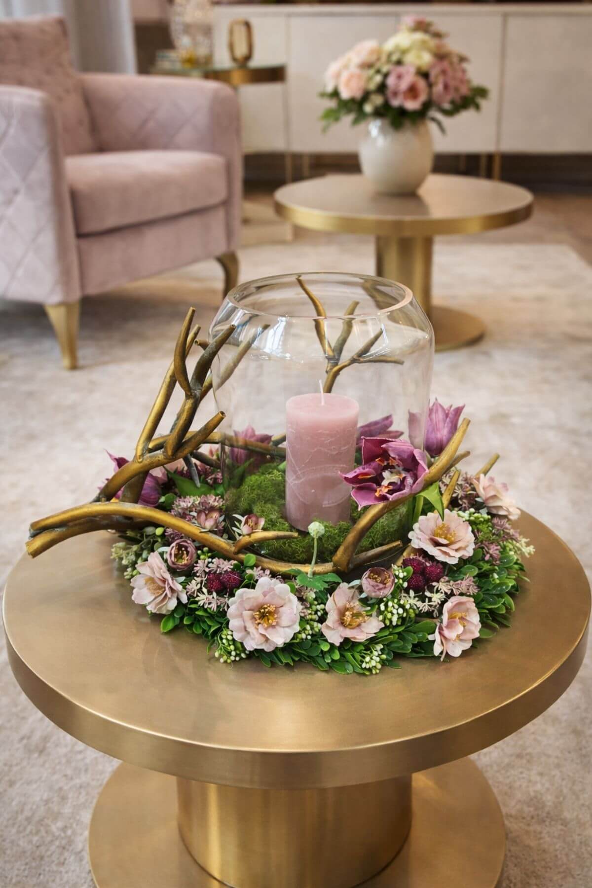 Elegantná dekorácia s kovovými zlatými vetvami, bohato zdobeným vencom z kvetov a zelene vytvorí luxusný a štýlový doplnok do každého interiéru.
