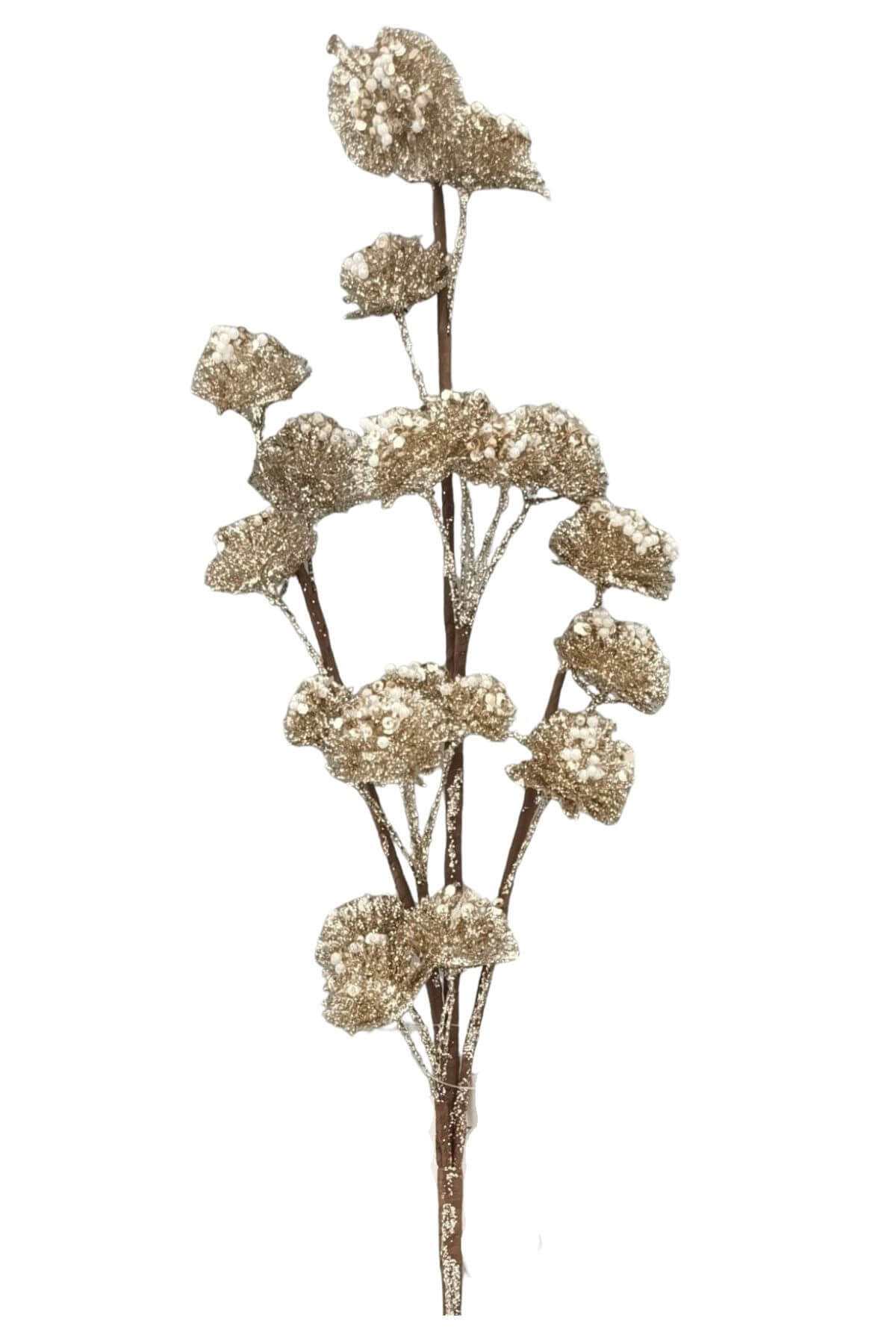 Zlatá bobuľová halúzka s trblietkami krásne vynikne v rôznych vianočných a zimných kyticiach, vianočných aranžmánoch a dekoráciách. Je vhodná aj ako doplnok do adventných vencov a ikebán.